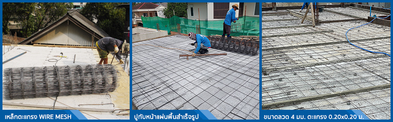 ใช้เหล็กตะแกรงสำเร็จรูป WIRE MESH ปูทับแผ่นพื้นสำเร็จรูปก่อนเทคอนกรีตทับหน้ากำลังอัด 240 KSC โดยใช้ขนาดลวด Ø4 มม. ตะแกรง 0.20x0.20 เมตร ตามรายการคำนวณของวิศวกร