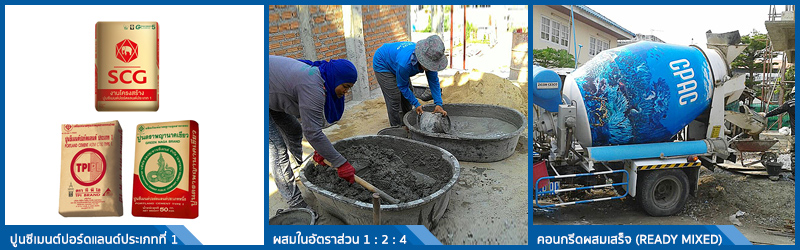 ใช้ปูนซีเมนต์ปอร์ตแลนด์ประเภทที่ 1 เช่น ตราช้าง, TPI แดง, พญานาค, เพชร เป็นต้น ผสมกับหินและทราย ในอัตราส่วน 1: 2 : 4 โดยปริมาตร ในส่วนของฐานราก, ตอม่อ, เสา และคาน โดยมีกำลังอัดประลัย 240 - 280 KSC (ทรงกระบอก) เมื่ออายุคอนกรีตได้ 28 วัน หรือตามที่ระบุในวัสดุมาตรฐาน หรือใช้คอนกรีตผสมเสร็จ (READY MIXED) กรณีที่สภาพพร้อมจะเทคอนกรีตในปริมาณมากๆ