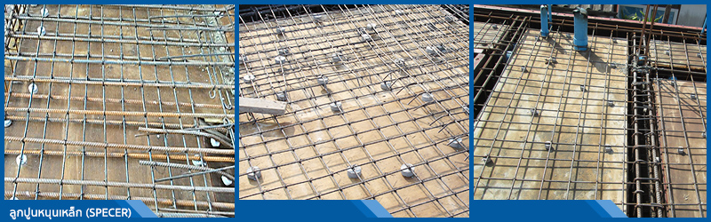 ใช้ลูกปูนหนุนเหล็ก (SPACER) เพื่อไม่ให้เหล็กเส้นสัมผัสกับไม้แบบด้านล่างและด้านข้าง จนแน่ใจว่า COVERING ถูกต้องเท่านั้น