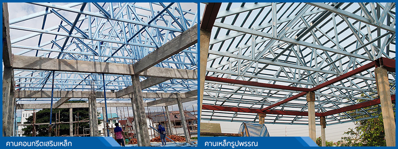 คานรับโครงเหล็กหลังคา อะเส, ขื่อ และดั้งรับอกไก่ รอบบนและรอบล่าง ใช้เป็นคานคอนกรีตเสริมเหล็ก หรือบางหลังใช้ร่วมกับเหล็กรูปพรรณแล้วแต่รายการคำนวณของวิศวกร