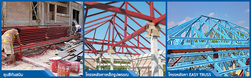 โครงหลังคาใช้เหล็กรูปพรรณ(บางหลัง)ตามรายการคำนวณของวิศวกร โดยทำการชุบเหล็กทั้งท่อนในถาดสำหรับชุบสี ทำให้เหล็กรูปพรรณดังกล่าวมีสีกันสนิมที่ผิวเหล็กทั้งชิ้นส่วน และเมื่อทำโครงหลังคาเสร็จแล้ว บนหลังคาบ้านจะทาสีกันสนิมซ้ำอีก 1 เที่ยว (เท่าที่แปรงทาสีจะสามารถทาได้) แต่ในบางหลังใช้โครงหลังคาเป็นโลหะชุบปลอดสนิม ทางเราใช้ EASY TRUSS ซึ่งภายในสมาคมธุรกิจรับสร้างบ้านใช้กันแพร่หลายและรับประกันทั้งวัสดุและการติดตั้ง 10 ปี โดยเจ้าของผลิตภัณฑ์