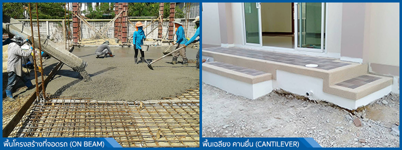 พื้นชั้นล่างทั้งหมดและที่จอดรถของบ้านทุกหลัง เป็นพื้นคอนกรีตถ่ายน้ำหนักลงที่คานโครงสร้าง (ON BEAM) จึงตัดปัญหาเรื่องการทรุดตัวของพื้น ในกรณีที่มีพื้นเฉลียง, พื้นซักล้าง, พื้นทางเดิน หากกว้างไม่เกินกว่า 1.60 เมตร และติดกับตัวบ้าน ทางบริษัทก็จะใช้คานยื่น (CANTILEVER) รับพื้นดังกล่าว ซึ่งไม่มีการทรุดตัวเช่นเดียวกันกับตัวพื้นภายในบ้าน ยกเว้นในแบบระบุเป็นอย่างอื่น หรือตามความต้องการของท่าน