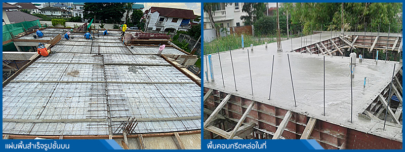 พื้นชั้นบนใช้แผ่นพื้นคอนกรีตสำเร็จรูปแบบท้องเรียบหรือแบบสามขา ถ่ายน้ำหนักลงที่คานโครงสร้าง (ON BEAM) และมีบางส่วน เช่น ระเบียง, กันสาด, พื้นห้องน้ำ จะเป็นการเทพื้นคอนกรีตหล่อในที่ตามความเหมาะสม