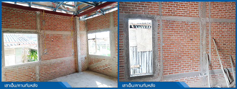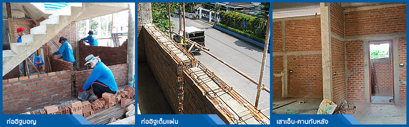 งานก่ออิฐผนังบ้าน โดยปกติทางบริษัทฯ ใช้อิฐมอญก้อนใหญ่รีดด้วยเครื่อง หรือบล็อคตัน EKO BLOCK เพื่อก่อผนังทั้งหลัง เนื่องจากมีความสะดวกในการทำงาน และแข็งแรงทนทาน อีกทั้งรับน้ำหนักสิ่งของที่จะมาติดตั้งและแขวนกับผนังได้ดี ยกเว้นบางแบบอาจมีการก่ออิฐซ้อนผนังกันเป็น 2 ชั้น (ก่ออิฐเต็มแผ่น) เพื่อลบเหลี่ยมมุมเสาในบ้าน และเพื่อง่ายต่อการปรับเปลี่ยนแบบของท่านจากมาตรฐานในระหว่างก่อสร้างเมื่อท่านเปลี่ยนใจ และทางเรายังเสริมความแข็งแกร่งของผนัง เพื่อป้องกันการแตกร้าวโดยการเทเสาเอ็นและคานทับหลัง คสล.ที่แนวกลางผนังและตามที่ผนังหักมุม ตามขอบรอบวงกบประตู – วงกบหน้าต่าง ตามหลักวิชาช่าง