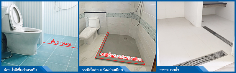 อีกทั้งภายในห้องน้ำเกือบทุกแบบ เรายังแยกพื้นที่ส่วนแห้งและส่วนเปียกให้ต่างระดับกันประมาณ 2-5 ซม. เพื่อความปลอดภัยของเจ้าของบ้านและง่ายต่อการทำความสะอาด หรือกั้นทำธรณีที่พื้น แล้วแต่แบบและความประสงค์ของท่าน