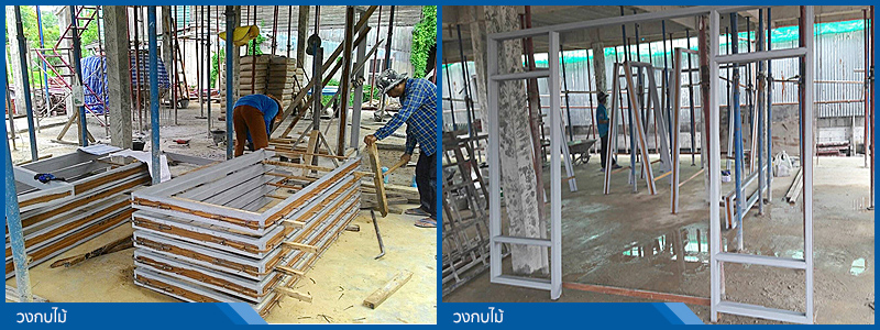 เราตั้งขาวงกบไม้ ให้ฝังลงไปในผิวคอนกรีตพื้น เพื่อความมั่นคงเป็นอันดับแรก ทุกมุมด้านนอกของวงกบ เราจะนำเหล็กข้ออ้อยไม่เล็กกว่า Ø12 มม. งอเป็นฉากรัดมุมที่หัววงกบไม้ ป้องกันการยืดหดเป็นอันดับสอง เทเสาเอ็นและคานทับหลัง คสล. รัดรอบนอกป้องกันการยืดหดเป็นอันดับสาม และตัดตาข่ายกรงไก่แปะทับมุมนอกทุกมุม ทุกด้าน ก่อนฉาบปูน ช่วยป้องกันการแตกร้าวเป็นเส้นตามมุมวงกบอีกทีนึงเป็นอันดับสี่ โดยทั้งหมดนี้ทางเราทำเพื่อให้ได้คุณภาพของงานออกมาอย่างดีที่สุด และเมื่อฉาบปูนผนังมาชนผิวนอกของวงกบเรายังชักร่องรอยต่อระหว่างไม้วงกบและปูนฉาบ เพื่อลดการซ่อมแซมเนื่องมาจากวงกบไม้ยืด-หด ตัว ภายหลัง (เพราะเป็นธรรมชาติของไม้ทุกชนิดที่จะยืด-หดตัว ตามสภาพอากาศในบ้านเรา)